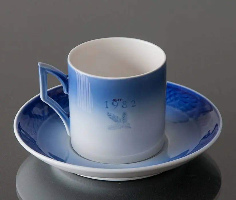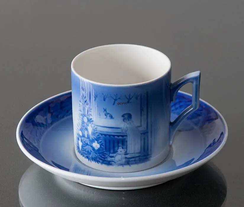 1982 Royal Copenhagen Christmas cup and saucer, designed by Kaj Lange, has the same motif as the 1982 Royal Copenhagen Christmas plate. The title of this Royal Copenhagen cup 1982 is Waiting for Christmas. The motif shows a child watching a lonely hare in the winter landscape. All of the Royal Copenhagen cups are decorated under the glaze. The capacity is 1,5 dl.
