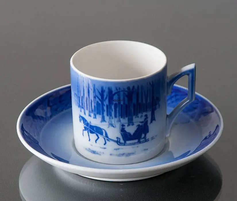 1984 Royal Copenhagen Christmas cup and saucer, designed by Kaj Lange, has the same motif as the 1984 Royal Copenhagen Christmas plate. The title of this Royal Copenhagen cup 1984 is Jingle Bells. All of the Royal Copenhagen cups are decorated under the glaze. The capacity is 1,5 dl.