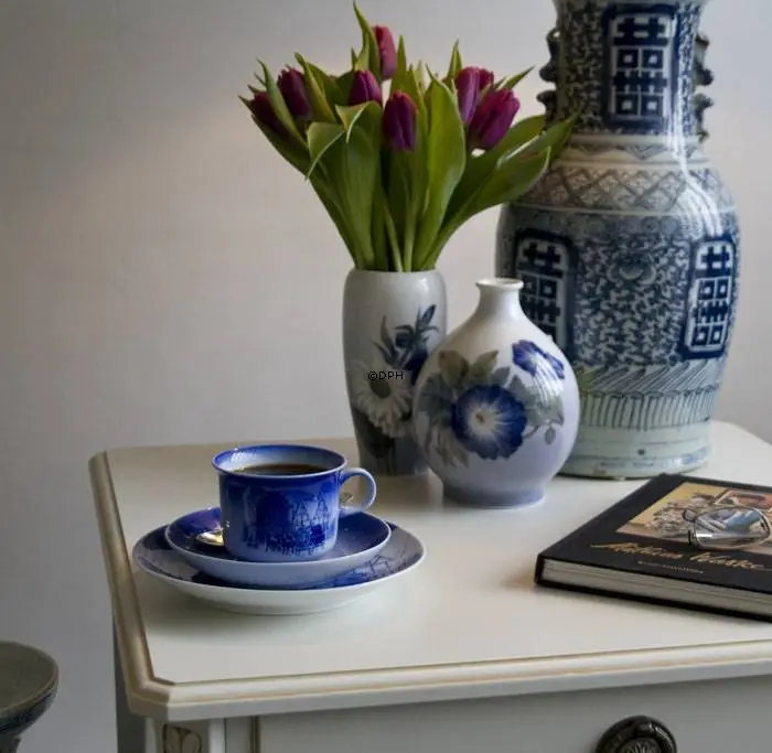 The motif of this 1992 Desirée annual cup from The Porcelain Factory Desiree, also known as Désirée Denmark, Svend Jensen of Denmark, Old Copenhagen Blue is The Round Tower which is found in the Hans Christian Andersen novel To be or not to be The 1992 Hans Christian Andersen Annual Cup had the same motif as the 1992 Svend Jensen Christmas plate. So the 1992 Desiree Annual Cup and the 1992 Desiree Christmas plate are actaully a beautiful coffee set with plate and cup. With inspiration from Hans Christian Andersens novel “To be or not to be”, the designer Svend Otto S., has painted The Round Tower on the Annual cup of this year. When you are in the Round Tower and are standing on the viewing point you are 35 meters above the street. To get to the point from which there is a view you have to walk through a wide passage, formed like a spiral. The passage is covered with paving stones because it should be possible for a horse carriage to drive to the library. From the library you have to walk through steps the rest of the way to get to the viewing point. Désirée started the Annual cup series in 1982 and ended it in 2001. So 20 different sets were made to complete a perfect coffee set. All motifs of the Hans Christian Andersen annual cups from Désirée are inspired by Hans Christian Andersen´s Fairy Tales.