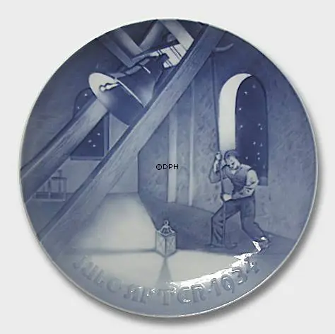 1934 Bing & Grondahl Christmas plate, designed by Immanuel Tjerne, bears the title Church Bell in Tower. Bing & Grondahl’s Christmas plate from 1934 depicts a bellringer ringing the bell of the church tower on Christmas Eve. The church bells have four functions: communication, warning, encouraging prayer, and the marking of feasts and festive days, as here Christmas Evening.