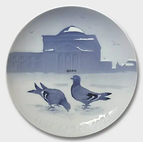 1921 Bing & Grondahl Christmas plate, designed by Achton Friis, bears the title Pigeons in the Castle Court. Bing & Grondahl’s Christmas plate from 1921 depicts pigeons in front of Christians- borg chapel, situated on an island in Copenhagen called Slotsholmen. The palace chapel lies like a Greek tempel between Christiansborg palace and thorvaldesen’s museum. The church was built in new classical style by C.F.Hansen, and it was opened in 1826 at the 1000 year anniversary for the introduction of Christianity in Denmark. In 1992 the church was ravaged by a fire, but it was rebuilt and opened at Queen Margrethe’s 25 year anniversary as Denmark’s Queen, in 1992.