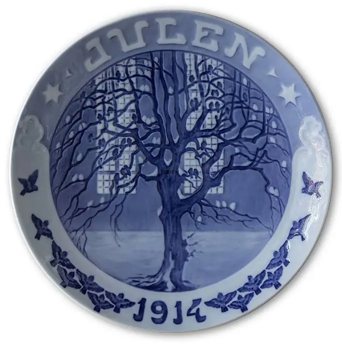 1914 Royal Copenhagen Christmas plate, designed by Arthur Boesen, has the title Sparrows in a tree in front of a lit church window (the church of the Holy Spirit i Copenhagen) Royal Copenhagen’s Christmas plate from 1914 depicts sparrows in an old tree,in the autumn. This tree is situated outside a lighted window of the church of the Holy Ghost in Copenhagen, the capital of Denmark.This plate differs from all other Christmas in that birds decorate the border of the plate. Royal Copenhagen Christmas plate 1914 was only produced in 1914.