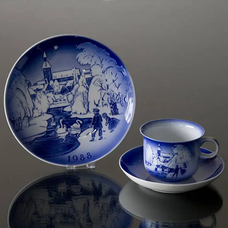 The motif of this 1988 Desiree Christmas plate from the Porcelain Factory Desiree, also known as Désirée Denmark, Svend Jensen of Denmark, Old Copenhagen Blue is found in the Hans Christian Andersen fairytale The Bell Deep. In the Hans Christian Andersen fairytale named “The Bell Deep”, the old church bell from Saint Albani Church in Odense is lying at the deepest place in the small river through Odense. The bell is ringing from its deep and is telling the citizens about its experiences in the church tower. Among other things the bell tells about the murder of the Danish King Knud. Later he was named Canute the Holy and gave the name to the present Saint Canute’s Cathedral or Odense Cathedral. The artist behind this Christmas plate is Svend Otto S. Désirée started the Christmas plate series in 1970 and ended it in 2002. All motifs of the Hans Christian Andersen Christmas plates from Désirée are inspired by Hans Christian Andersen´s Fairy Tales