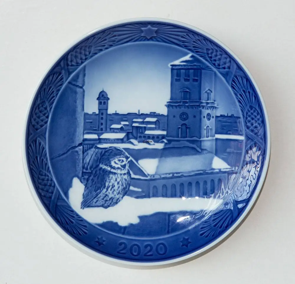 The Christmas plate shows a little owl sitting in the Round Tower at the Trinity Church overlooking the Church of Our Lady, which is the cathedral of Copenhagen and the present church building was built in classicist style and consecrated in 1829. The church has burnt down and been rebuilt several times in its history. The Church of Our Lady became the cathedral of Copenhagen in 1922.