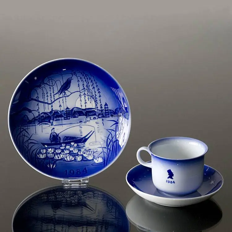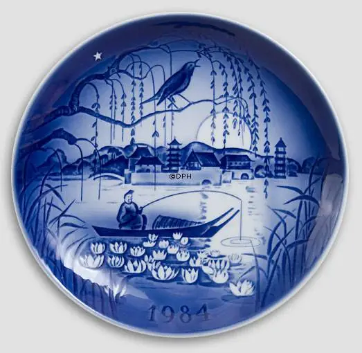 The motif of this 1984 Desiree Christmas plate from the Porcelain Factory Desiree, also known as Désirée Denmark, Svend Jensen of Denmark, Old Copenhagen Blue is found in the Hans Christian Andersen fairytale The Nightingale. The fairytale named “The Nightingale” by Hans Christian Andersen has been the inspiration for the 1984 Christmas plate. The small nightingale lives in some branches in trees along the seacoast of China. Every night, when the poor fisherman is sitting in his dinghy and is working with his net, he has to take a break and listen to the song from The Nightingale. Because of its song The Nightingale becomes famous and the emperor wants to hear it sing. Even through the emperor wants The Nightingale to stay it will not leave the branches over the sea. The artist behind this Christmas plate was Sven Otto S. Désirée started the Christmas plate series in 1970 and ended it in 2002. All motifs of the Hans Christian Andersen Christmas plates from Désirée were inspired by Hans Christian Andersen´s Fairy Tales