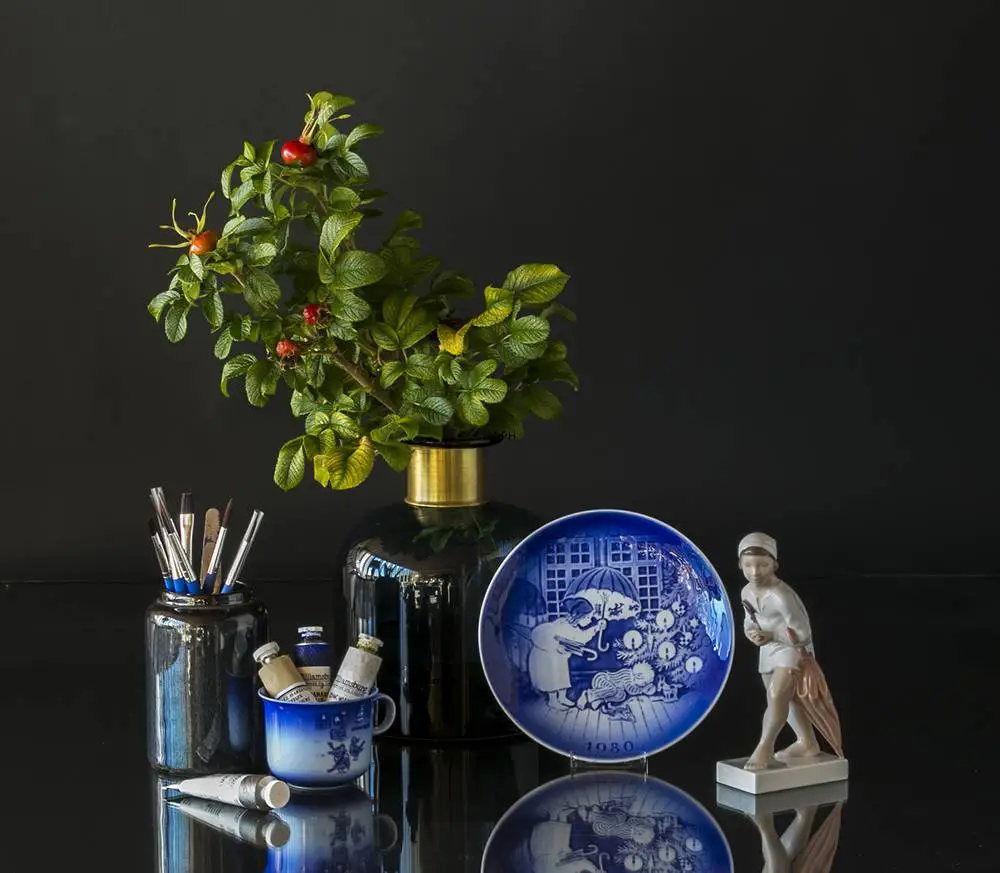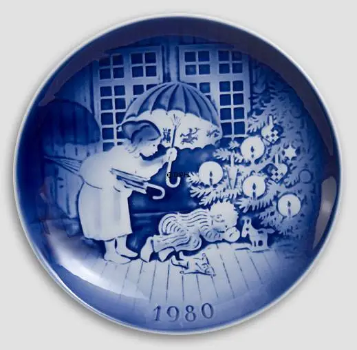 The motif of this 1980 Desiree Christmas plate from the Porcelain Factory Desiree, also known as Désirée Denmark, Svend Jensen of Denmark, Old Copenhagen Blue is found in the Hans Christian Andersen fairytale The Sandman. At the Christmas plate we see “The Sandman” by Hans Christian Andersen. The Sandman holds his umbrella over the little boy named Hjalmer. The Sandman has to umbrellas. He has one umbrella with pictures. This umbrella he raises over good children and then they are getting nice dreams. The other umbrella has no pictures and this one he raises over naughty children, who will then get no dreams. Hjalmer is a good boy and because of The Sandman’s umbrella with pictures he is having good dreams every night. However The Sandman tells him to work for good marks. The 1980 Christmas plate was designed by Svend Otto S. Désirée started the Christmas plate series in 1970 and ended it in 2002. All motifs of the Hans Christian Andersen Christmas plates from Désirée were inspired by Hans Christian Andersen´s Fairy Tales