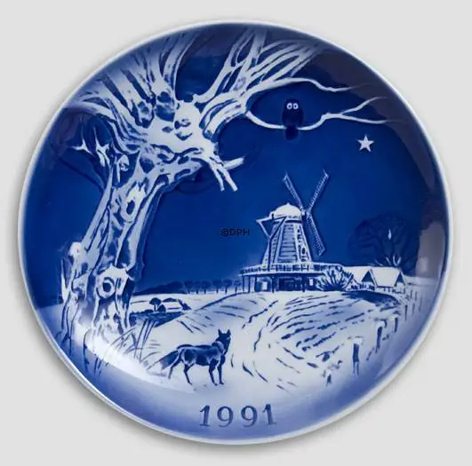 The motif of this 1991 Desiree Christmas plate from the Porcelain Factory Desiree, also known as Désirée Denmark, Svend Jensen of Denmark, Old Copenhagen Blue is found in the Hans Christian Andersen fairytale The Windmill. The old Dutch mill in the Hans Christian Andersen fairytale “The Windmill” was at the top of a hill. With this fairytale as his inspiration the artist Svend Otto S., designed the 1991 Desiree Christmas plate. Désirée started the Christmas plate series in 1970 and ended it in 2002. All motifs of the Hans Christian Andersen Christmas plates from Désirée were inspired by Hans Christian Andersen´s Fairy Tales