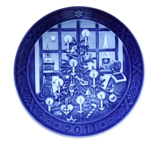2011 Royal Copenhagen Christmas plate, designed by Sven Vestergaard, has the title Waiting for Santa Claus. The story tells that the first Christmas tree was introduced in Copenhagen in 1811 by a young man and his family. The candles on the tree caused a lot of interest from the people on the street in Copenhagen and yet is was not a tradition before several years later. Today is the beautiful tree with candles and homemade decorations pivotal point of our Danish Christmas Eve. The 2011 Royal Copenhagen Christmas plate shows the boy waiting for Santa Claus.