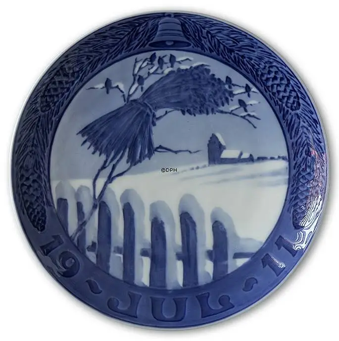 1911 Royal Copenhagen Christmas plate, designed by Oluf Jensen, has the title Wooden fence with sheaf of corn. Royal Copenhagen Christmas plate 1911 was only produced in 1911. Royal Copenhagen’s 1911 Christmas plate is the first plate with the measurement, which has from than on become the standard measure of the Christmas plate. The motif is a typically Danish winter landscape covered in snow, with a country church in the background and a sheaf of corn to feed the wild birds in the fore- ground. At winter time, many people in Denmark feed the wild birds, which have great difficulty in finding food because of the cold weather and snow. The pine cones from the 1909 plate is used in this plate at the border of the plate. These pine cones are seen in many of the succeeding plates.